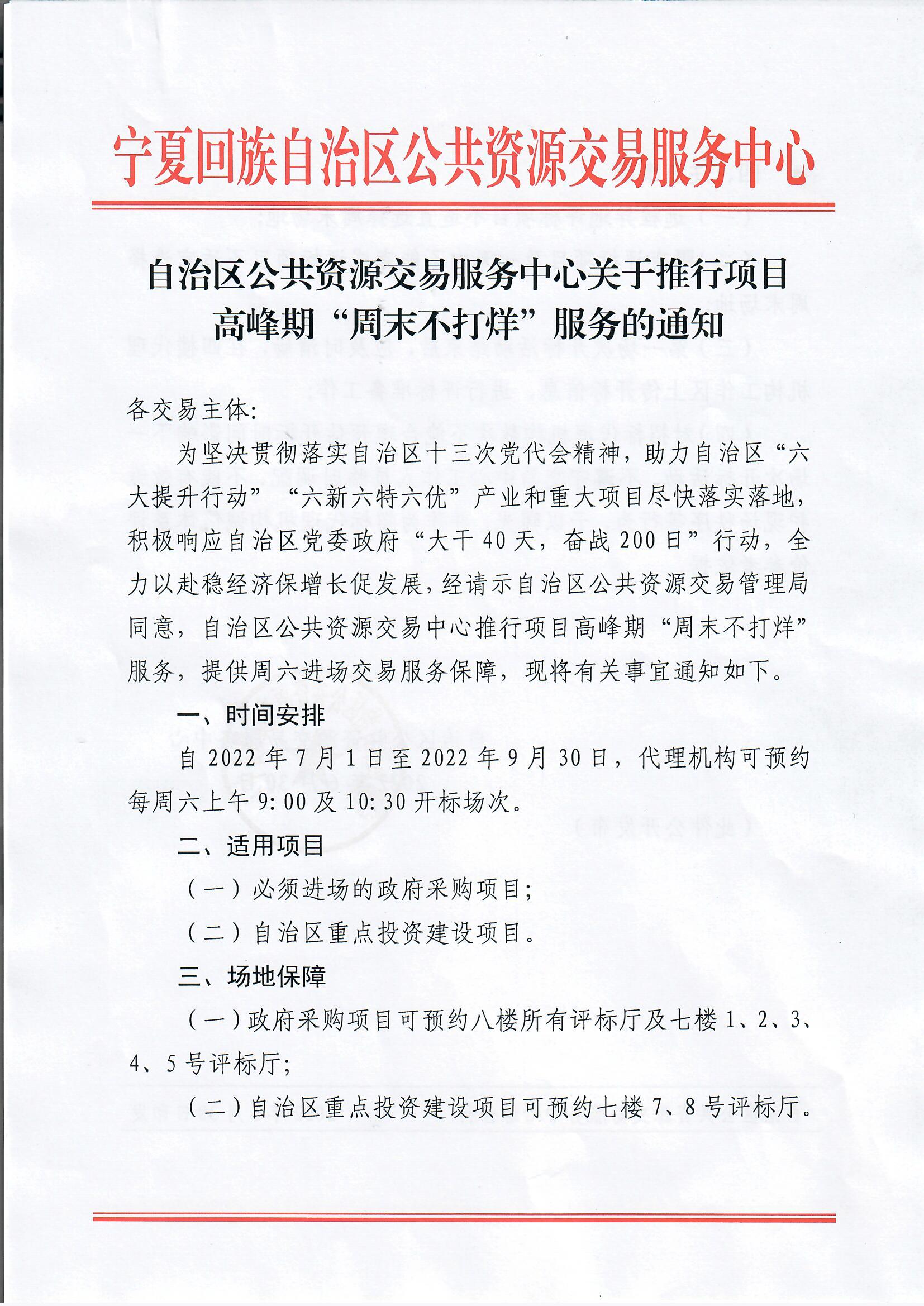 【宁夏】宁夏回族自治区公共资源交易服务中心关于推行项目高峰期“周末不打烊”服务的通知