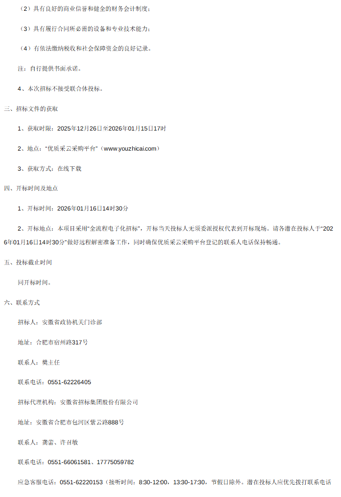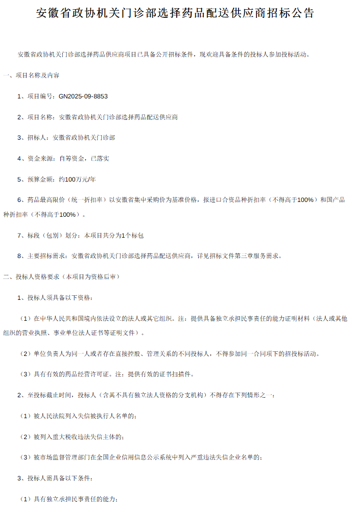 【安徽省政协机关门诊部】安徽省政协机关门诊部选择药品配送供应商招标公告