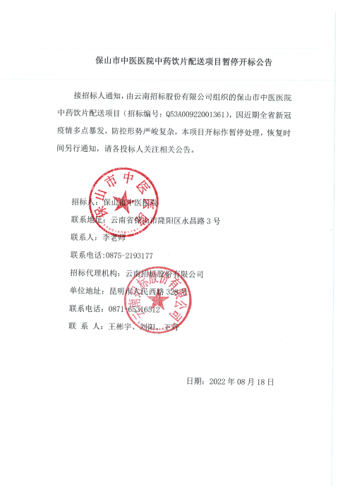 【保山市中医医院】保山市中医医院中药饮片配送项目暂停开标公告