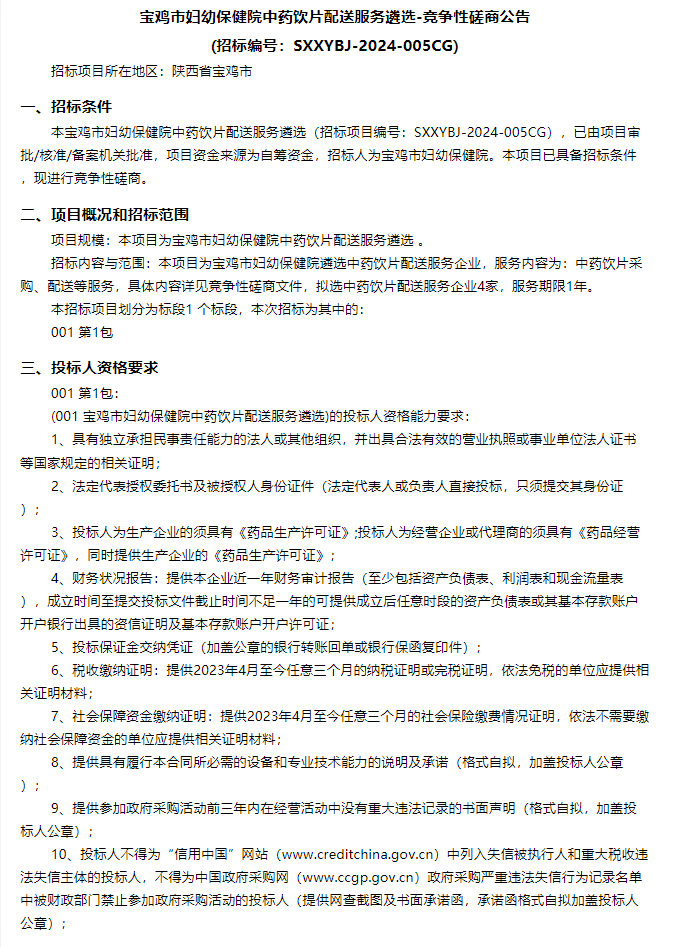 【宝鸡市妇幼保健院】陕西省宝鸡市妇幼保健院中药饮片配送服务遴选-竞争性磋商公告