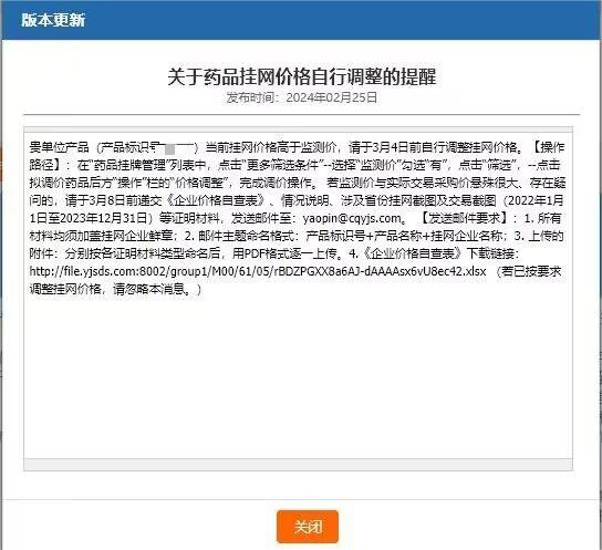 贵单位产品(产品标识号*******)当前挂网价格高于监测价,请于3月4日前自行调整挂网价格。