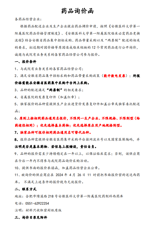 【安徽医科大学第一附属医院】安徽医科大学第一附属医院药品询价函(2024年第二次)