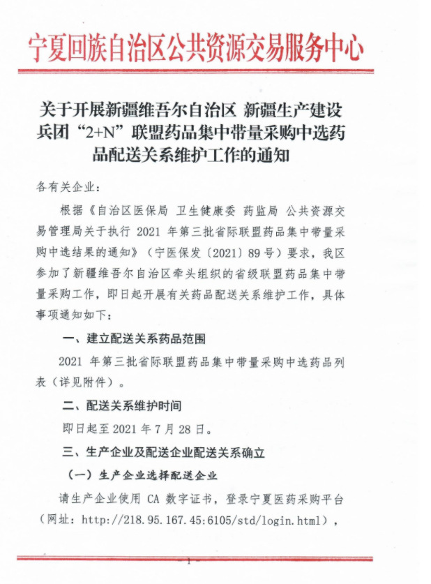 【宁夏】2021年宁夏自治区关于开展新疆维吾尔自治区新疆生产建设兵团“2+N”联盟药品集中带量采购中选药品配送关系维护工作的通知
