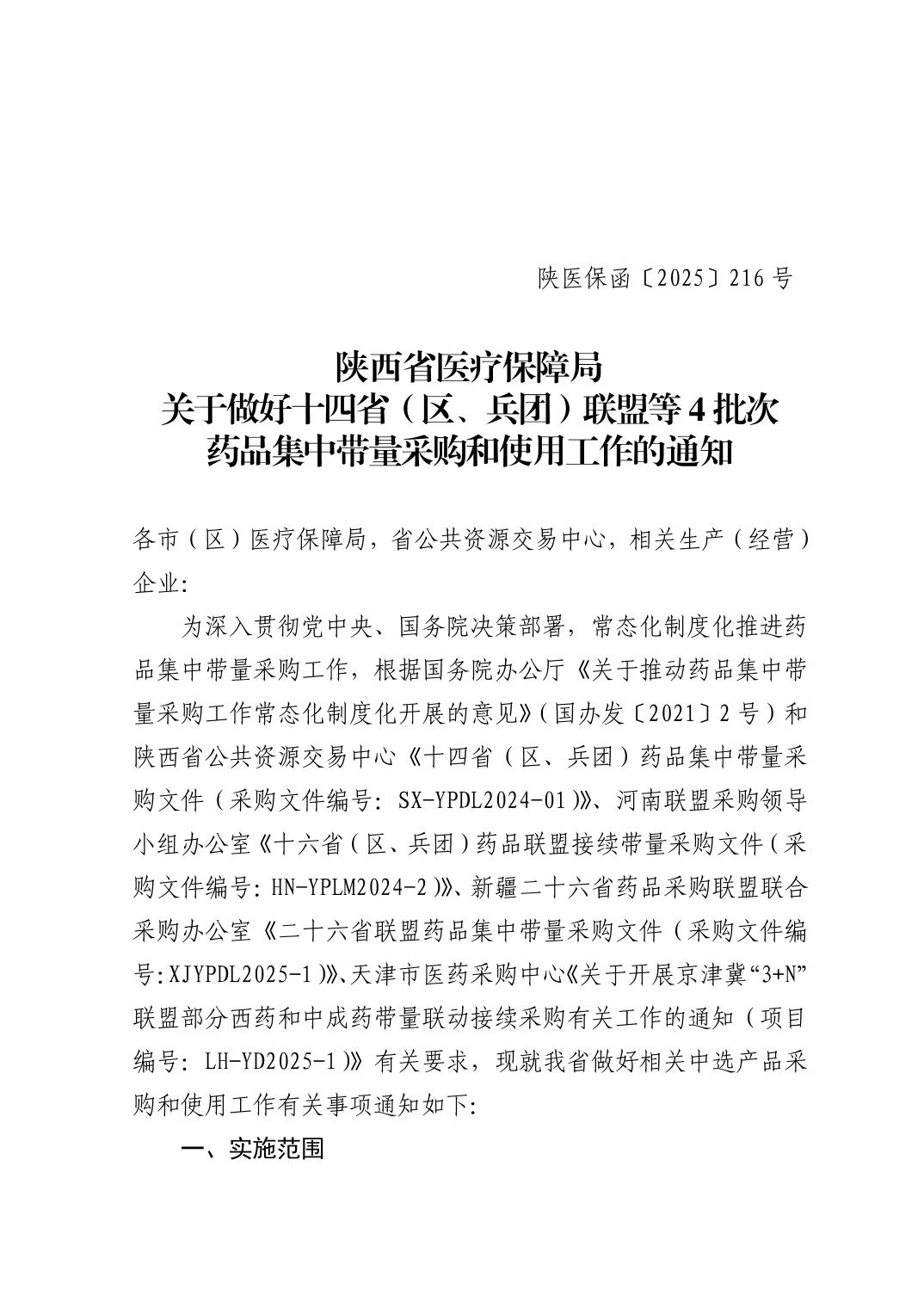 【陕西】陕西省医疗保障局关于做好十四省(区、兵团)联盟等 4 批次药品集中带量采购和使用工作的通知