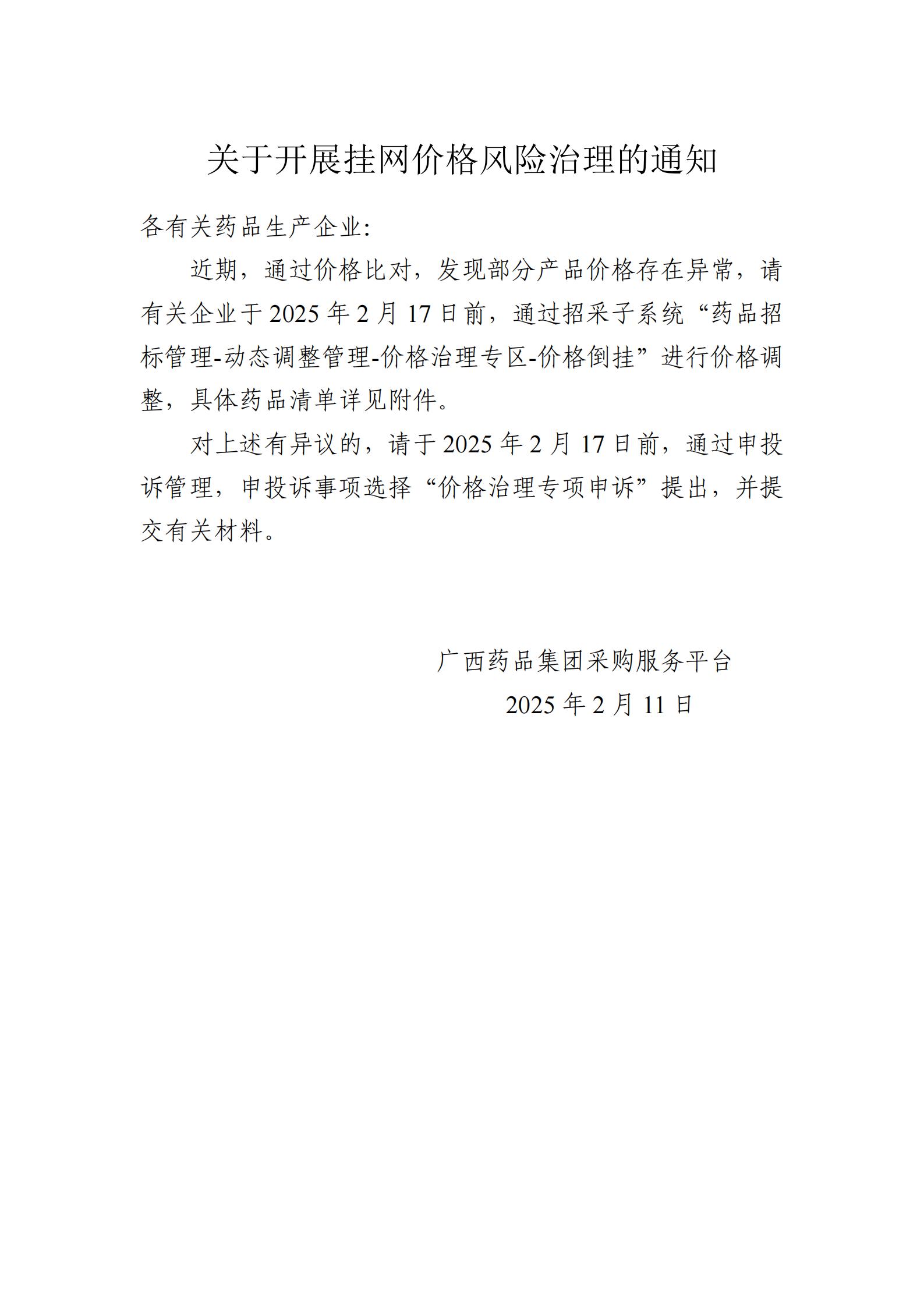 关于开展挂网价格风险治理的通知已发布,详情请查看附件。