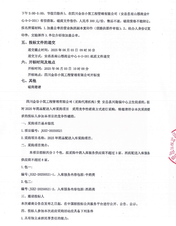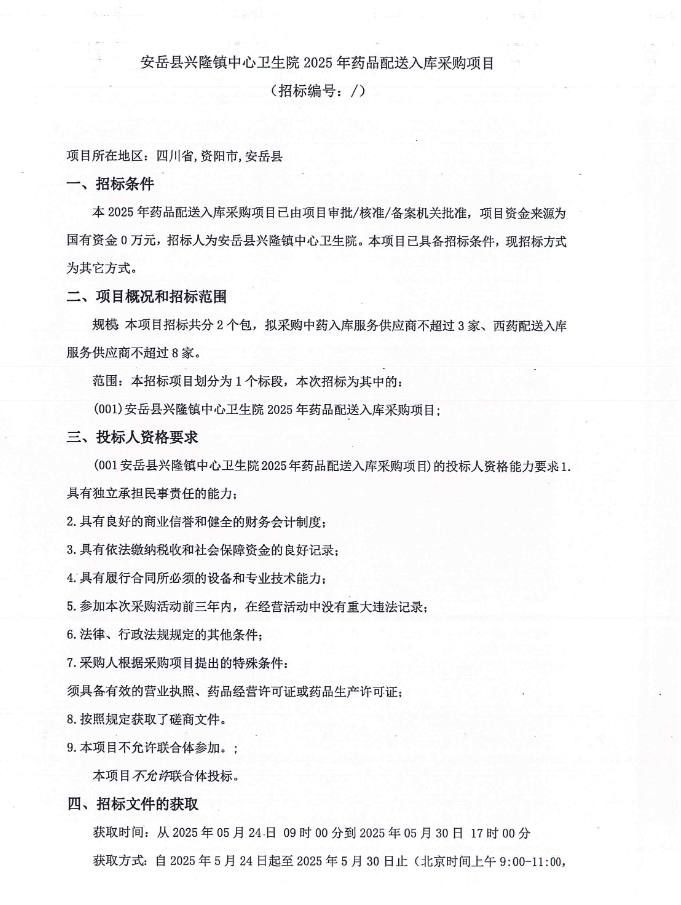 【资阳市安岳县兴隆镇中心卫生院】四川省资阳市安岳县兴隆镇中心卫生院2025年药品配送入库采购项目