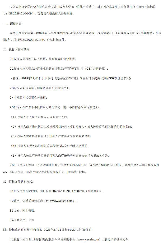 【安徽中医药大学第一附属医院】安徽中医药大学第一附属医院笔架社区医院西药成药配送企业采购招标公告