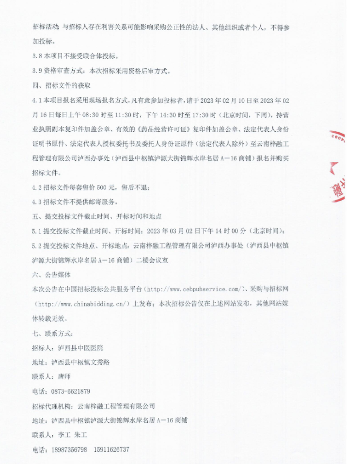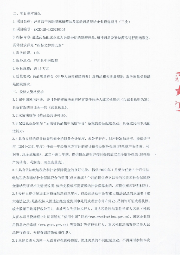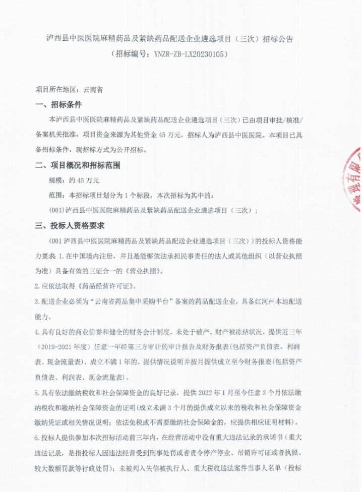 【红河哈尼族彝族自治州泸西县中医医院】云南省红河哈尼族彝族自治州泸西县中医医院麻精药品及紧缺药品配送企业遴选项目(三次)招标公告
