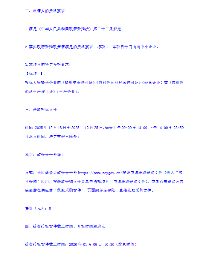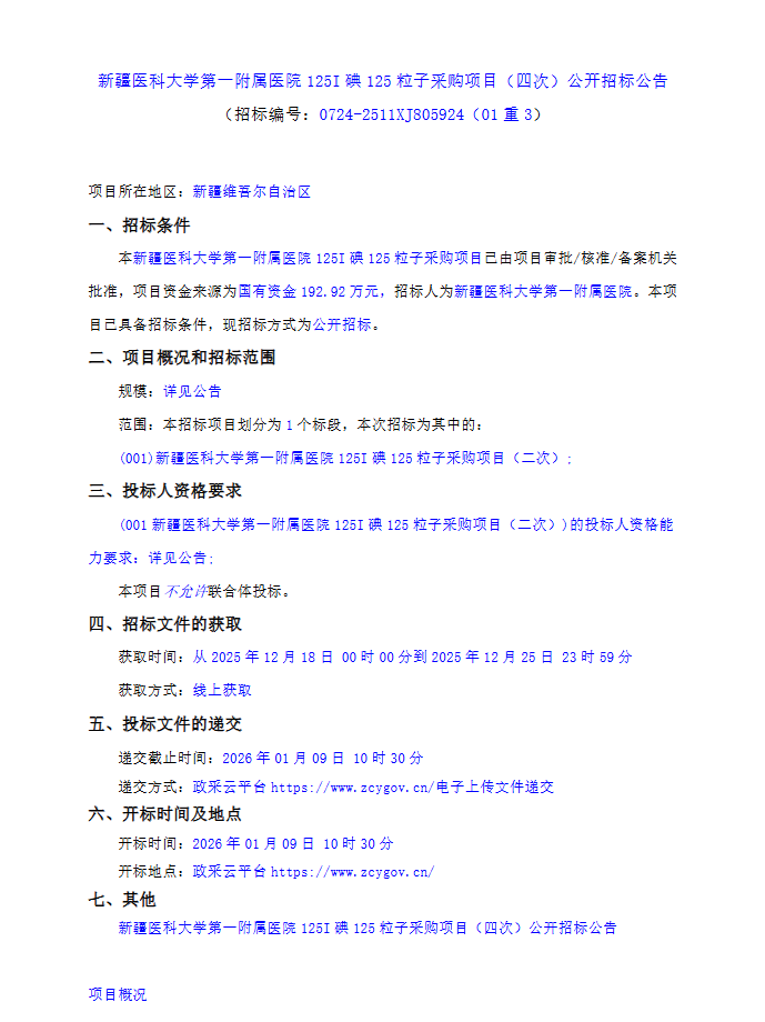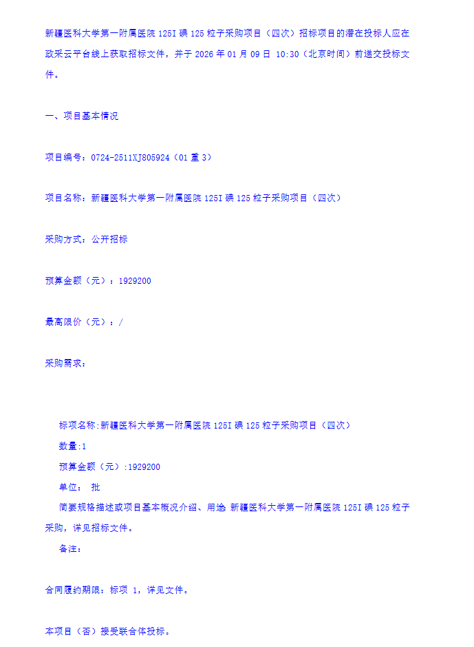 【新疆医科大学第一附属医院】新疆医科大学第一附属医院125I碘125粒子采购项目(四次)公开招标公告