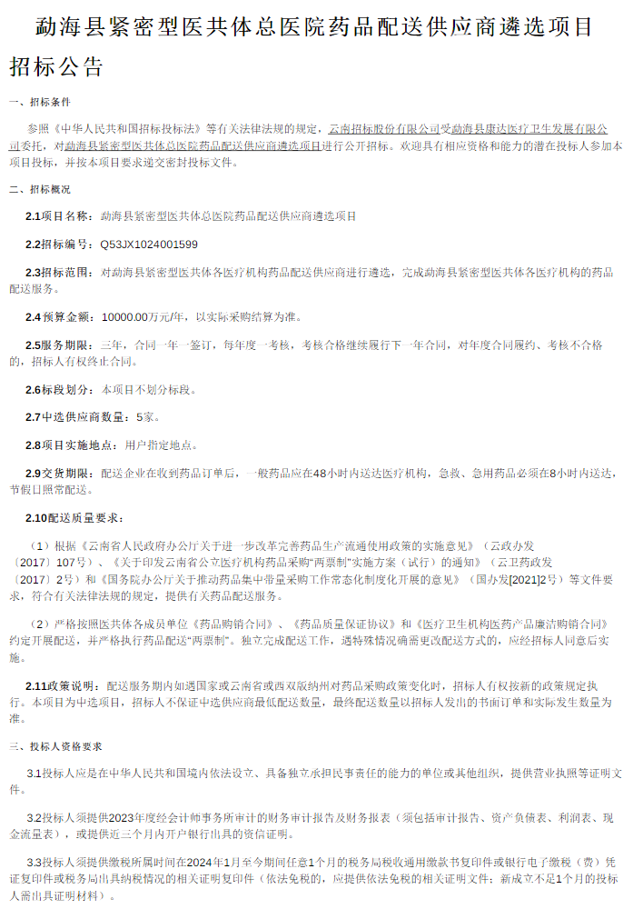 【西双版纳傣族自治州勐海县紧密型医共体总医院】云南省西双版纳傣族自治州勐海县紧密型医共体总医院药品配送供应商遴选项目招标公告