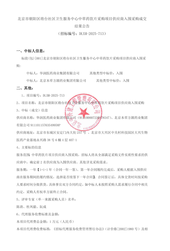 【北京市朝阳区将台社区卫生服务中心】北京市朝阳区将台社区卫生服务中心中草药饮片采购项目供应商入围采购成交结果公告
