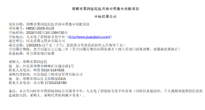 【邯郸市第四医院】河北省邯郸市第四医院医共体中药集中煎配项目中标结果公示