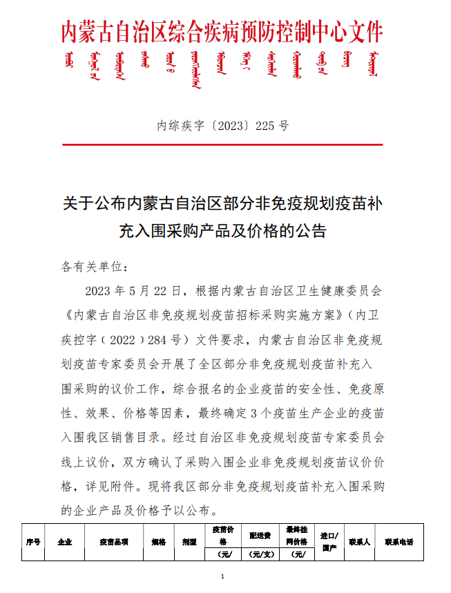 疾控字(2022)284号)文件要求,内蒙古自治区非免疫规划疫苗专家委员会开展了全区部分非免疫规划疫苗补充入围采购的议价工作,综合报名的企业疫苗的安全性、免疫原性、效果、价格等因素,最终确定3个疫苗生产企业的疫苗入围我区销售目录。经过自治区非免疫规划疫苗专家委员会线上议价,双方确认了采购入围企业非免疫规划疫苗议价价格,详见附件。现将我区部分非免疫规划疫苗补充入围采购的企业产品及价格予以公布。