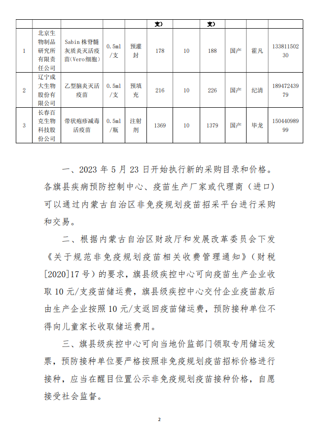 一、2023年5月23日开始执行新的采购目录和价格。各旗县疾病预防控制中心、疫苗生产厂家或代理商(进口)可以通过内蒙古自治区非免疫规划疫苗招采平台进行采购和交易。
