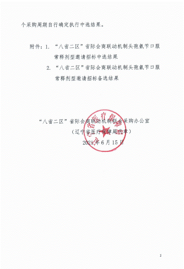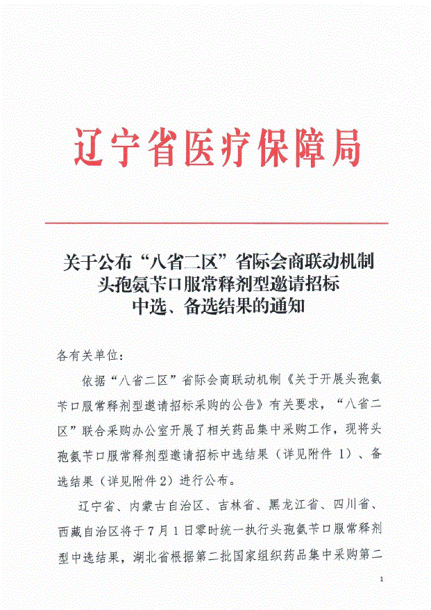 【内蒙】2021年内蒙古自治区转发关于公布“八省二区”省际会商联动机制头孢氨苄口服常释剂型邀请招标中选、备选结果的通知