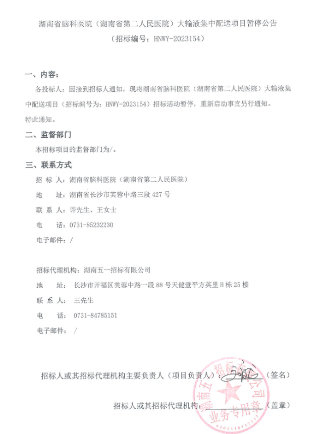 【湖南省脑科医院】湖南省脑科医院(湖南省第二人民医院)大输液集中配送项目暂停公告