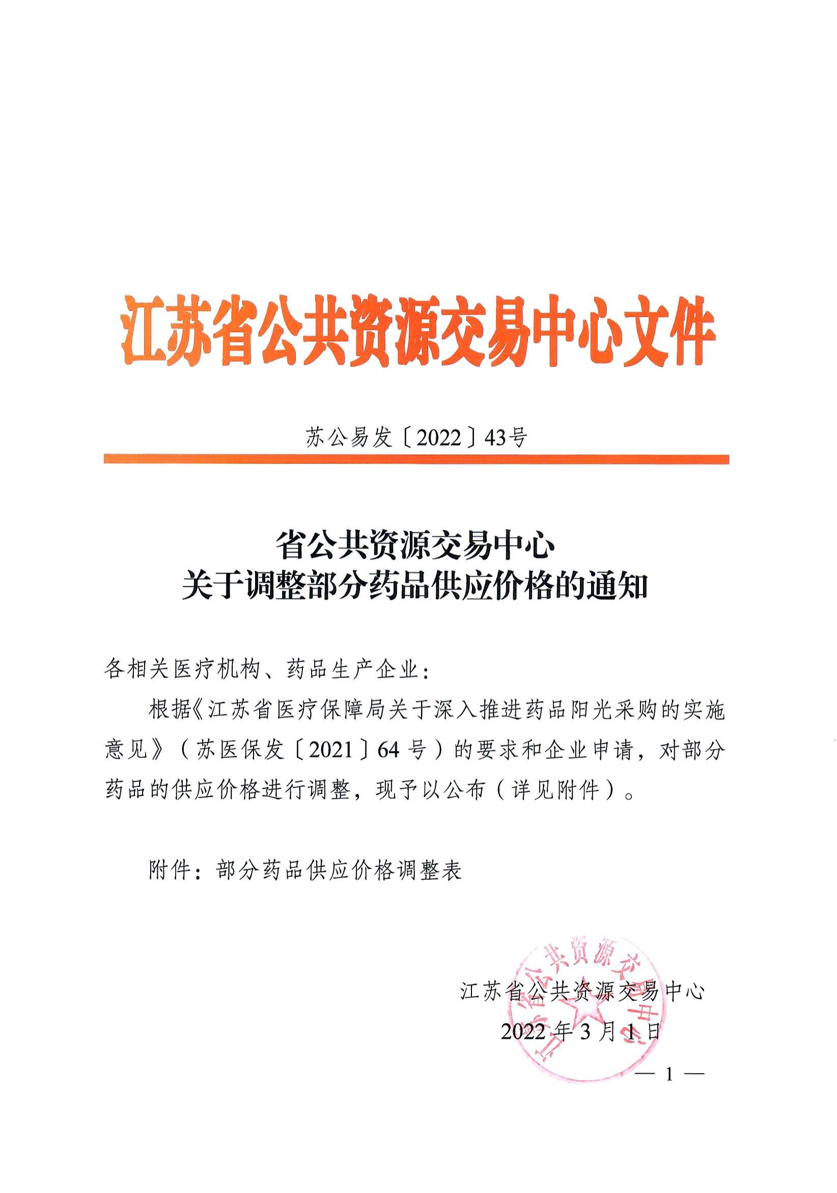 【江苏】江苏省公共资源交易中心关于调整部分药品供应价格的通知(20220301)