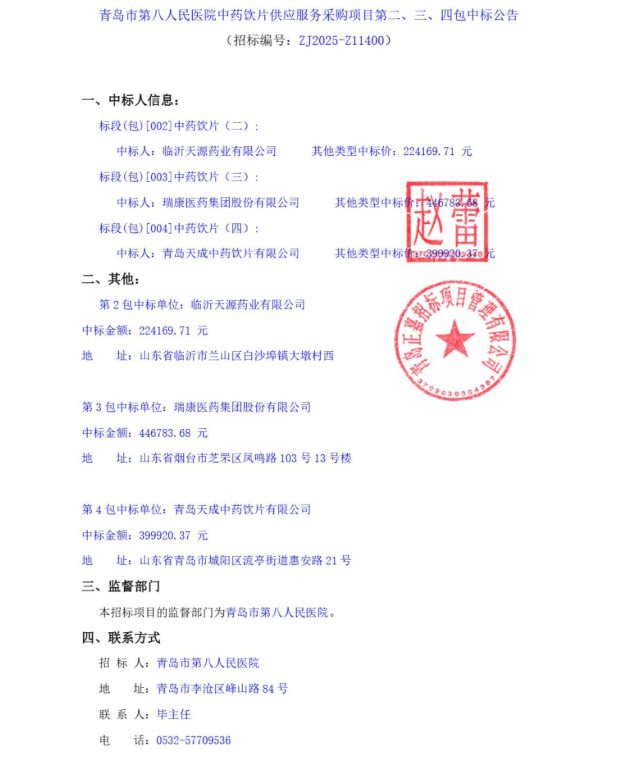 【青岛市第八人民医院】山东省青岛市第八人民医院中药饮片供应服务采购项目第二、三、四包中标公告