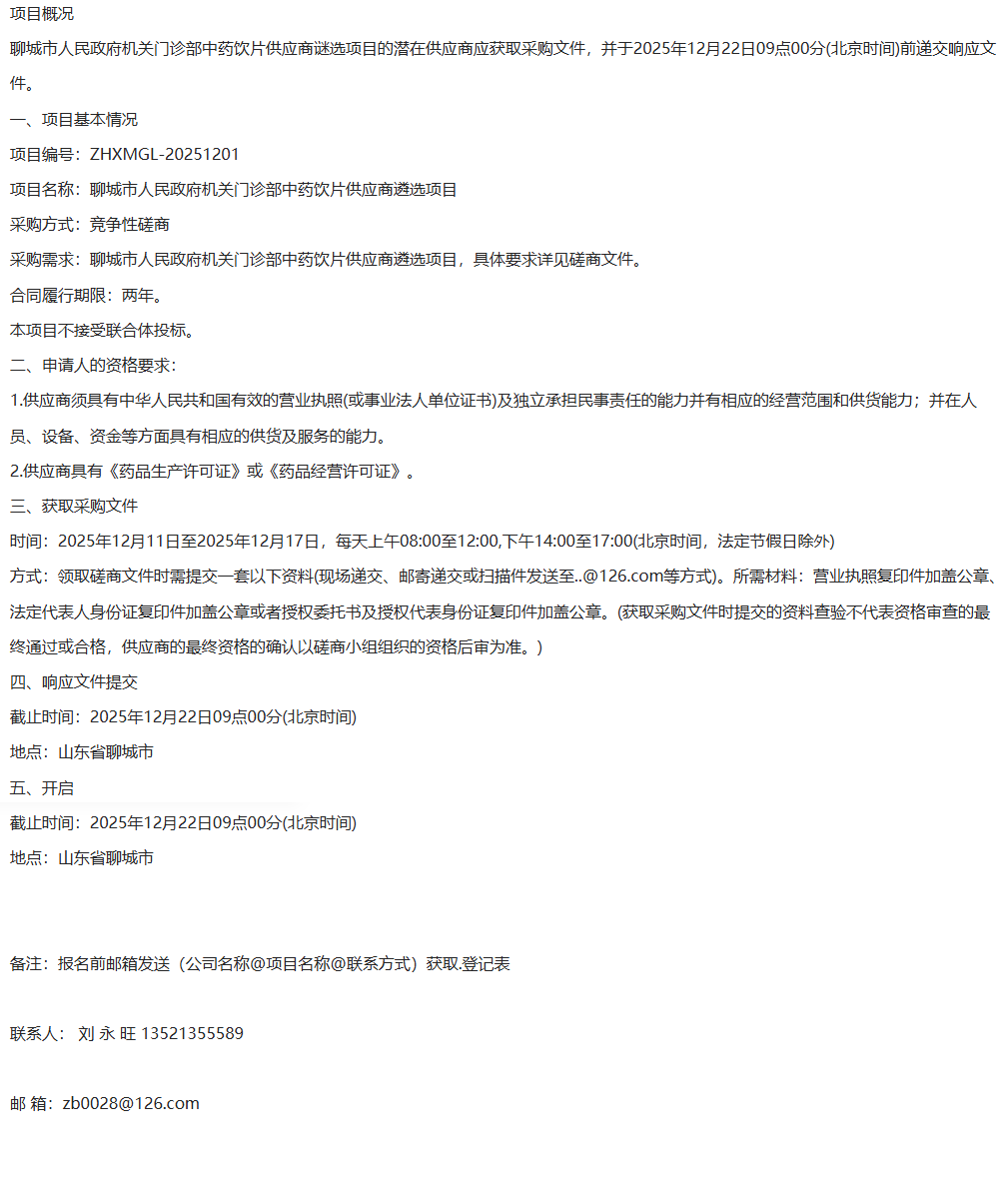 【聊城市人民政府机关门诊部】山东省聊城市人民政府机关门诊部中药饮片供应商遴选项目竞争性磋商公告