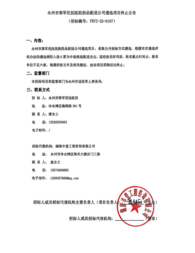 【永州市荣军优抚医院】湖南省永州市荣军优抚医院药品配送公司遴选项目终止公告