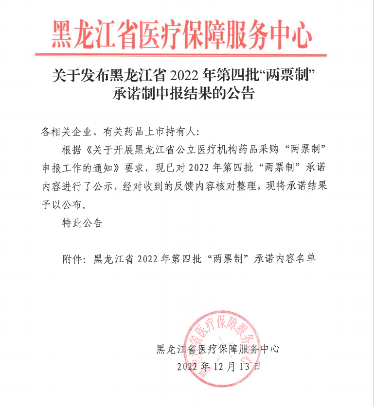 【黑龙江】关于发布黑龙江省2022年第四批“两票制”承诺制申报结果的公告
