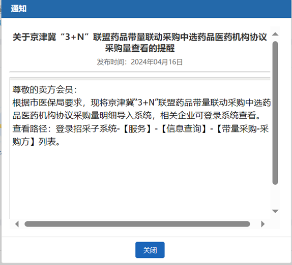 根据市医保局要求,现将京津冀“3+N“联盟药品带量联动采购中选药品医药机构协议采购量明细导入系统,相关企业可登录系统查看。查看路径:登录招采子系统-【服务】-【信息查询】-【带量采购-采购方】列表。