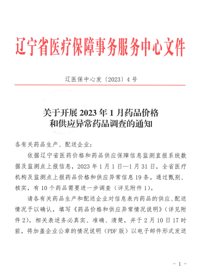 【辽宁】关于开展2023年1月份药品价格和供应异常药品调查的通知
