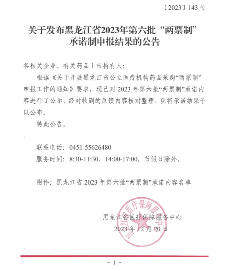 【黑龙江】关于发布黑龙江省2023年第六批“两票制”承诺制申报结果的公告