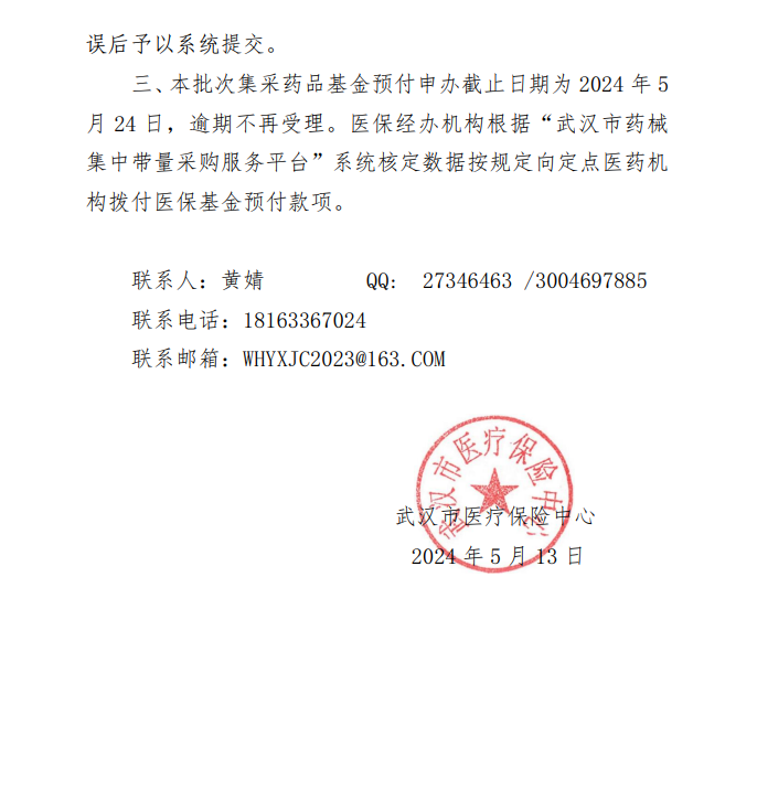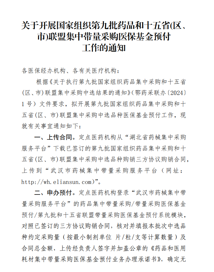【武汉】关于第九批药品和十五省集采药品基金预付工作的通知