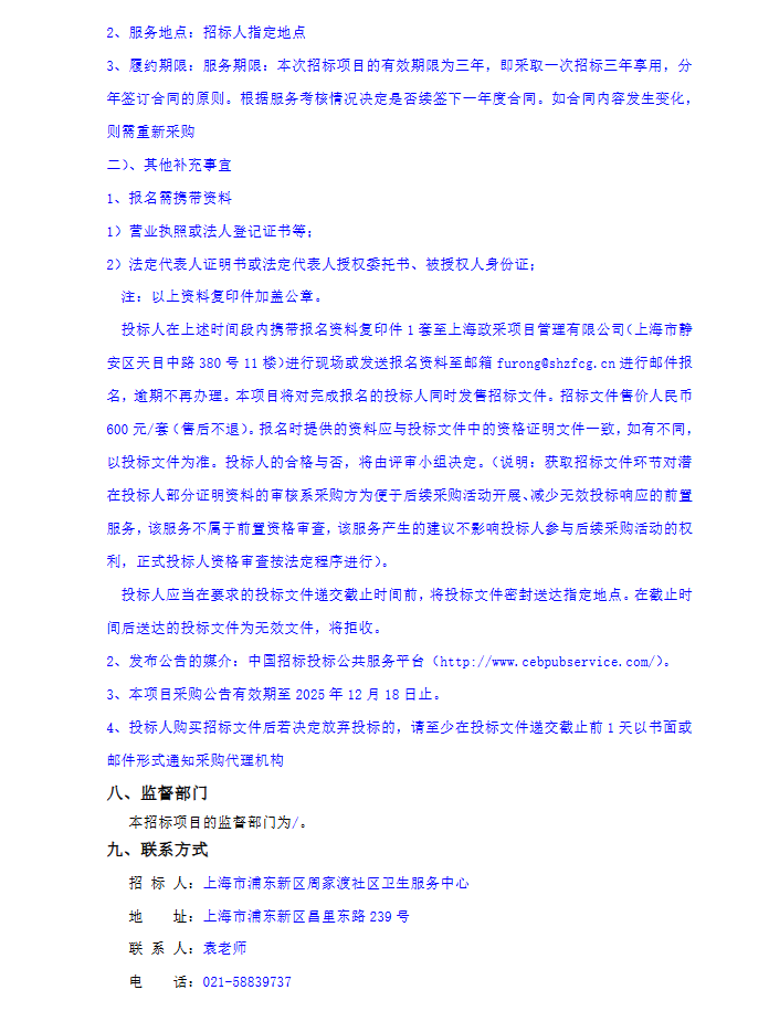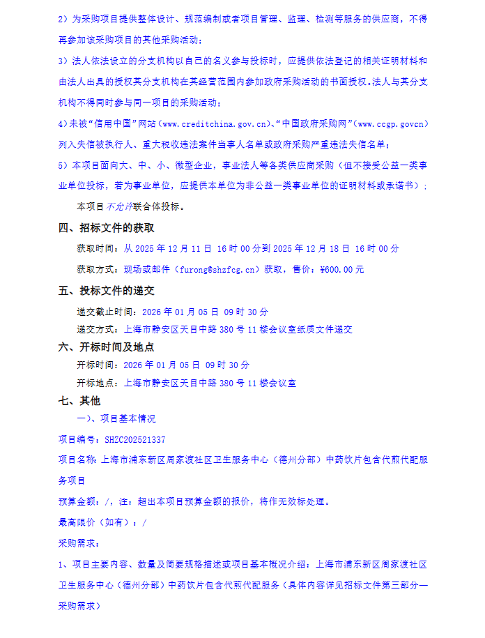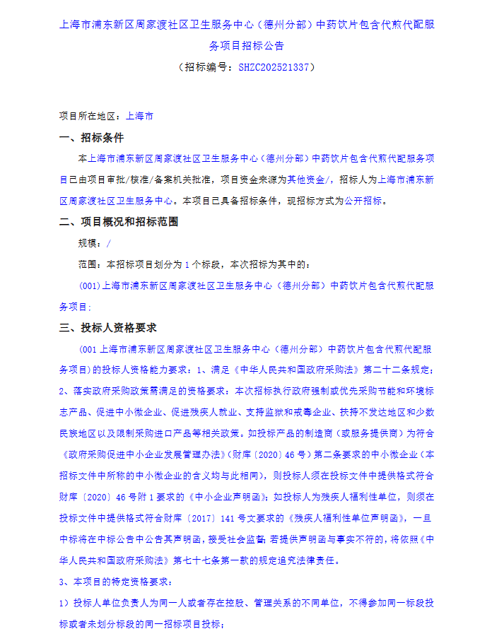 【上海市浦东新区周家渡社区卫生服务中心】上海市浦东新区周家渡社区卫生服务中心(德州分部)中药饮片包含代煎代配服务项目招标公告