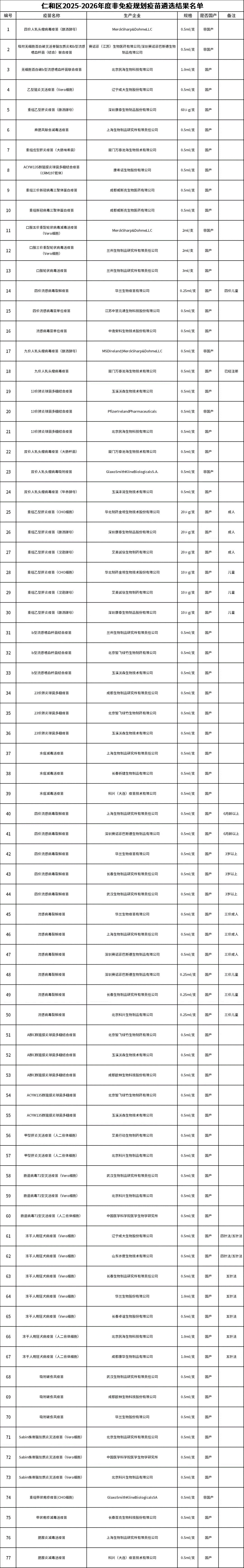 根据《中华人民共和国疫苗管理法》《四川省卫生与健康委员会关于印发疫苗全程管理风险防控工作方案的通知》《攀枝花市仁和区非免疫规划疫苗遴选采购方案(修订版)》等文件要求,为进一步规范全区非免疫规划疫苗采购管理,强化疫苗管理相关风险防控,保障非免疫规划疫苗质量和供应,攀枝花市仁和区疾控中心于2025年7月17日组织开展仁和区2025-2026年度非免疫规划疫苗遴选工作,现将结果向社会公示5个工作日(2025年7月18日至2025年7月24日)。公示期间,如有异议,请在规定的时间内向攀枝花市仁和区卫生健康局纪检监察组实名书面反映。监督联系电话:仁和区卫生健康局纪检监察组0812-2901816。