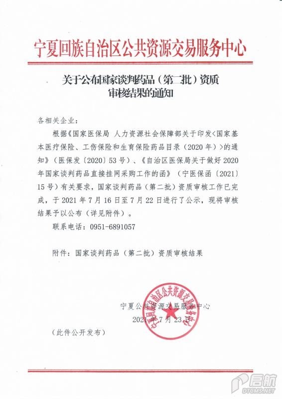 【宁夏】2021年宁夏自治区关于公布国家谈判药品(第二批)资质审核结果的通知