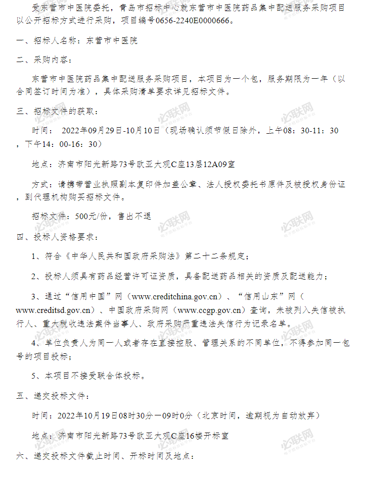 【东营市中医院】山东省东营市中医院药品集中配送服务采购项目招标公告