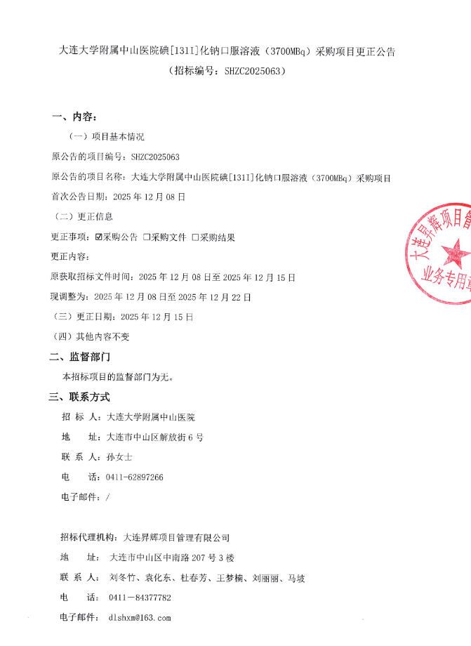 【大连大学附属中山医院】辽宁省大连大学附属中山医院碘〔131I〕化钠口服溶液(3700MBq)采购项目更正公告