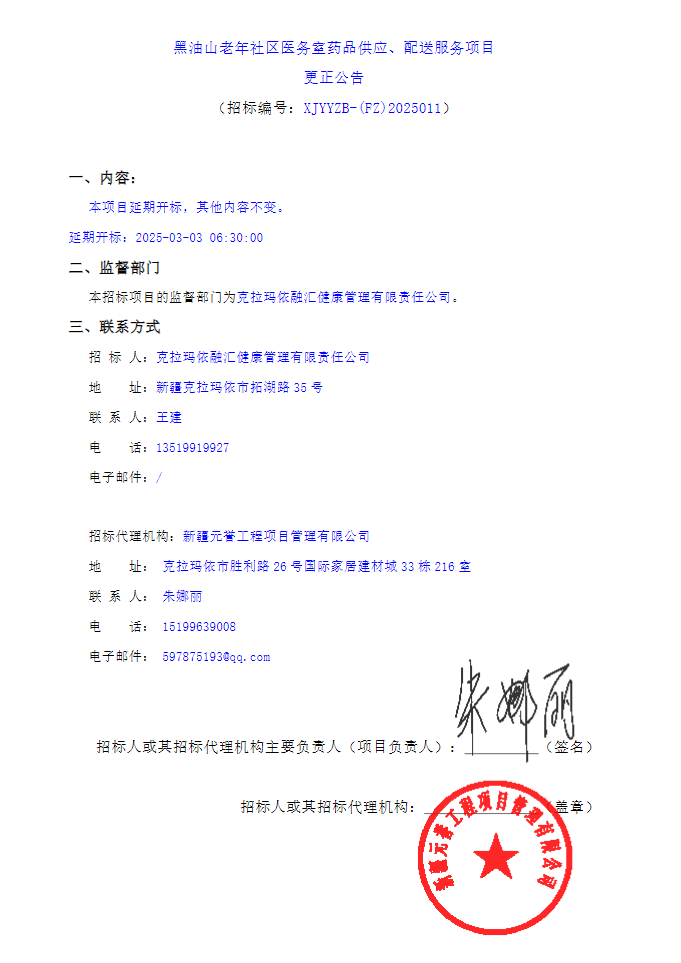 【克拉玛依市黑油山老年社区】新疆维吾尔自治区克拉玛依市黑油山老年社区医务室药品供应、配送服务项目更正公告(20250217)