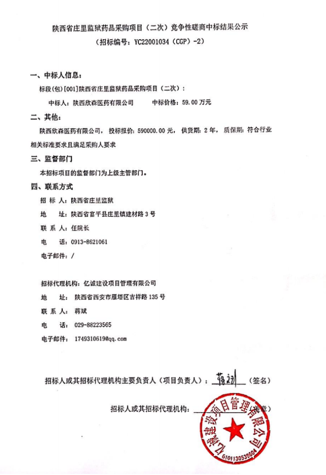 【陕西省庄里监狱】陕西省庄里监狱药品采购(二次)竞争性磋商中标结果公示