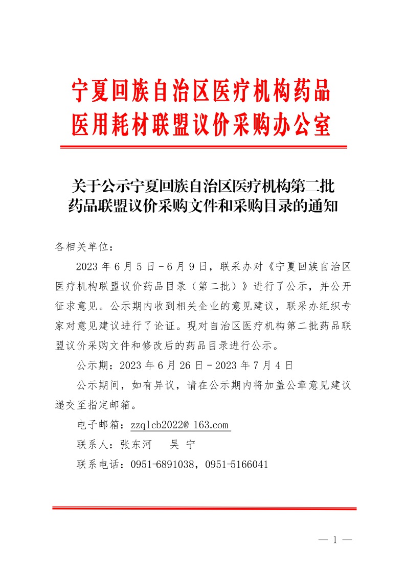 2023年6月5日-6月9日,联采办对《宁夏回族自治区医疗机构联盟议价药品目录(第二批)》进行了公示,并公开征求意见。公示期内收到相关企业的意见建议,联采办组织专家对意见建议进行了论证。现对自治区医疗机构第二批药品联盟议价采购文件和修改后的药品目录进行公示。