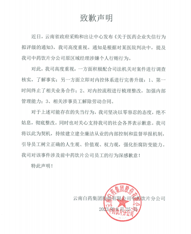 【云南】云南白药集团股份有限公司中药饮片分公司致歉声明
