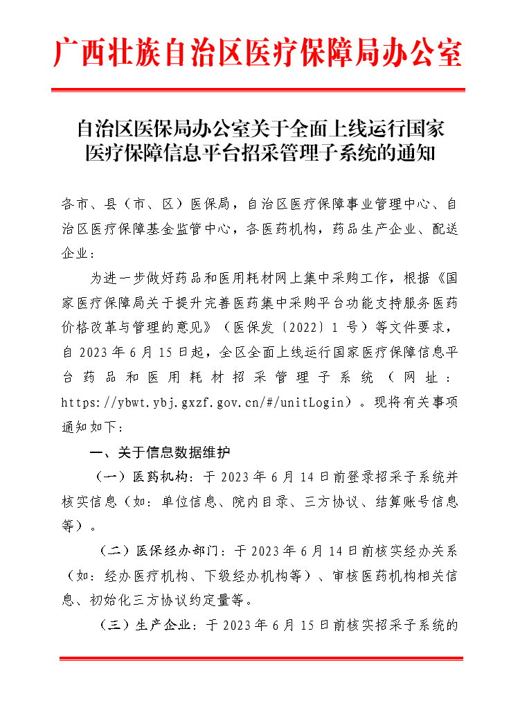 为进一步做好药品和医用耗材网上集中采购工作,根据《国家医疗保障局关于提升完善医药集中采购平台功能支持服务医药价格改革与管理的意见》 (医保发〔2022〕1号)等文件要求,自2023年6月15日起,全区全面上线运行国家医疗保障信息平台药品和医用耗材招采管理子系统 (网址:https://ybwt.ybj.gxzf.gov.cn/#/unitLogin)。现将有关事项通知如下: