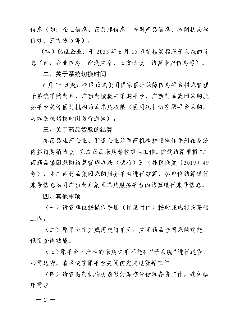 6月15日起,全区正式使用国家医疗保障信息平台招采管理子系统采购药品,广西药械集中采购平台、广西药品集团采购服务平台关停医药机构药品采购权限(医用耗材仍在原平台采购,具体系统切换时间另行通知)。