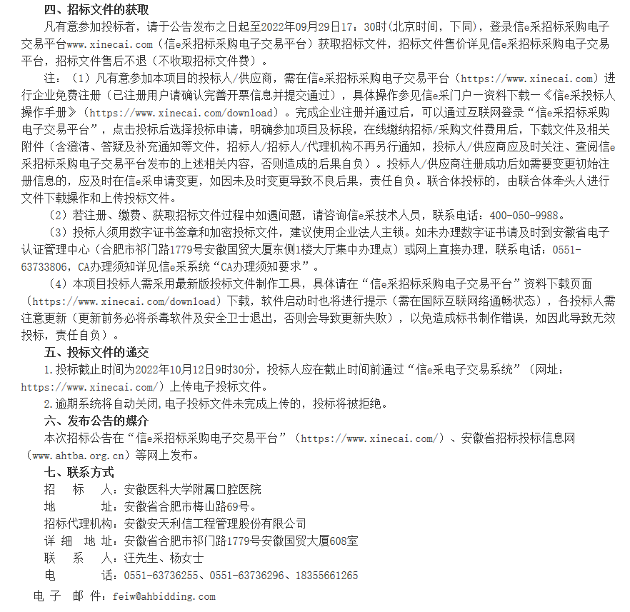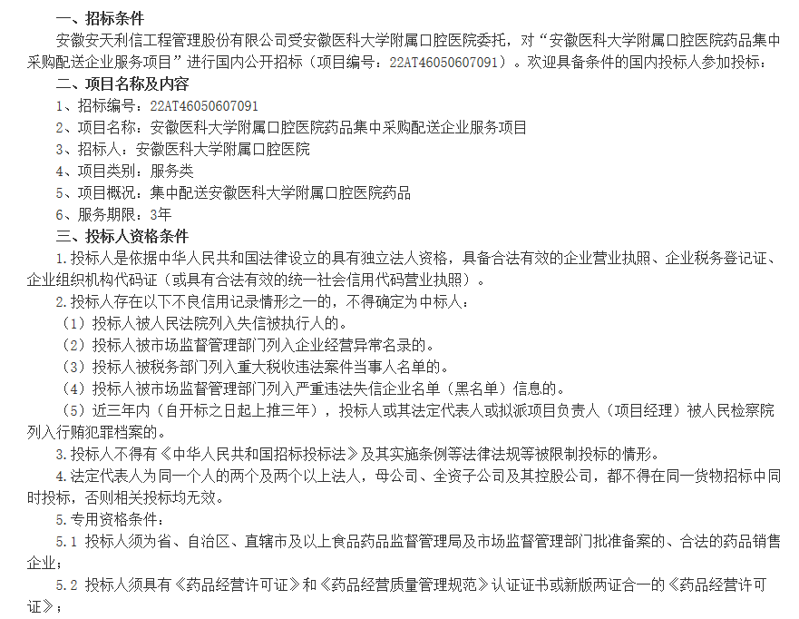 【安徽医科大学附属口腔医院】药品集中采购配送企业服务项目招标公告