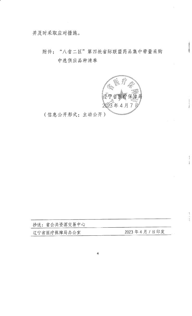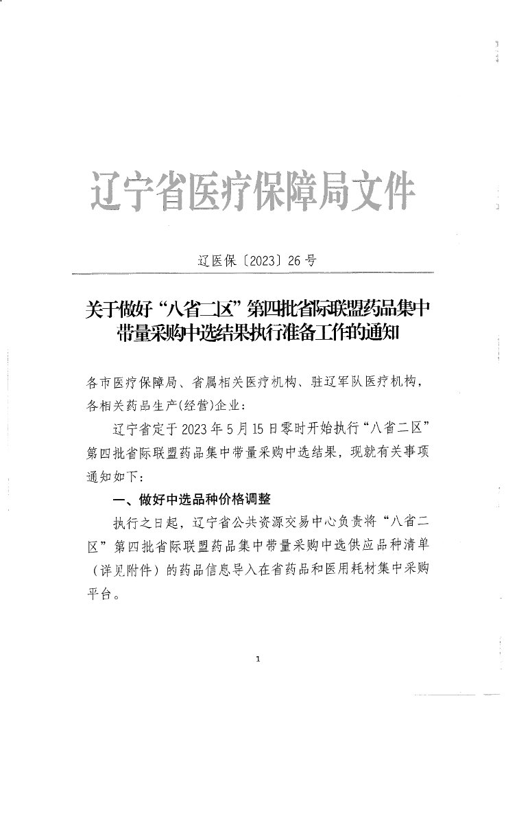 现将省医疗保障局《关于做好“八省二区”第四批省际联盟药品集中带量采购中选结果执行准备工作的通知》(辽医保〔2023〕26号)转发给你们,请遵照执行。