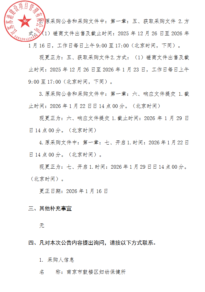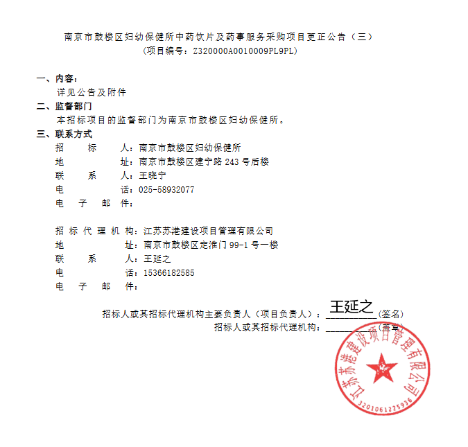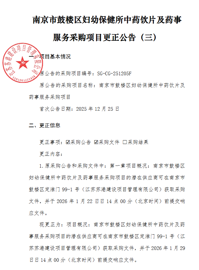 【南京市鼓楼区妇幼保健所】江苏省南京市鼓楼区妇幼保健所中药饮片及药事服务采购项目更正公告(三)