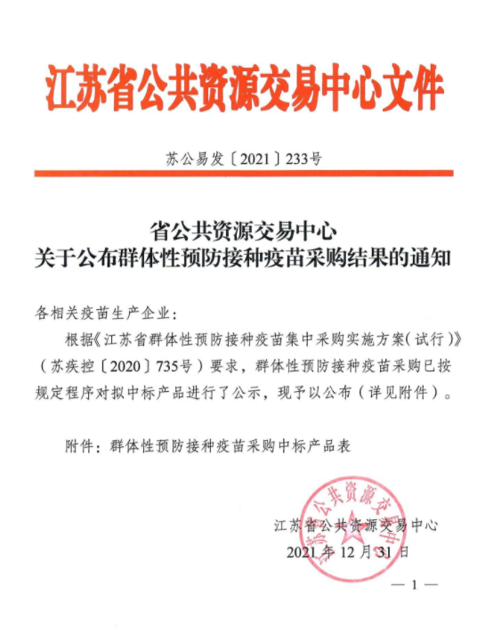 【江苏】江苏省公共资源交易中心关于公布群体性预防接种疫苗采购结果的通知(20211231)
