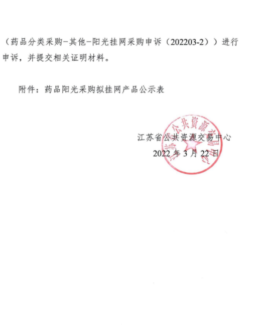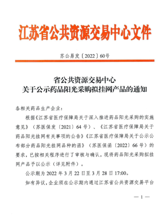 【江苏】江苏省公共资源交易中心关于公示药品阳光采购拟挂网产品的通知(20220322)