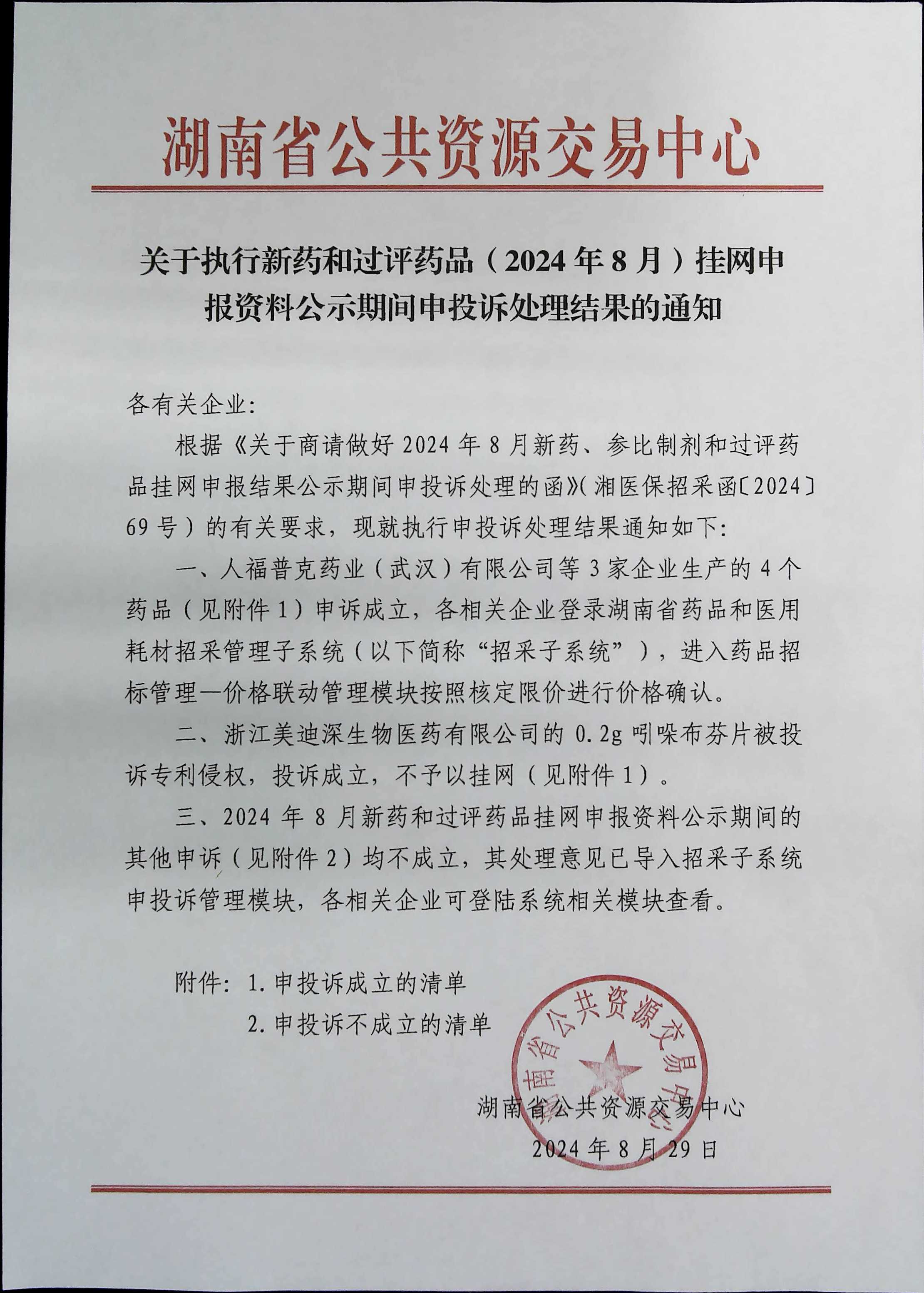 根据《关于商请做好2024年8月新药、参比制剂和过评药品挂网申报结果公示期间申投诉处理的函》(湘医保招采函〔2024〕69号)的有关要求,现就执行申投诉处理结果通知如下:
