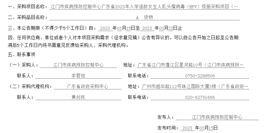 【江门市疾病预防控制中心】广东省江门市疾病预防控制中心广东省2023年入学适龄女生人乳头瘤病毒(HPV)疫苗采购项目(江门疾控中心)采购需求征求意见公告