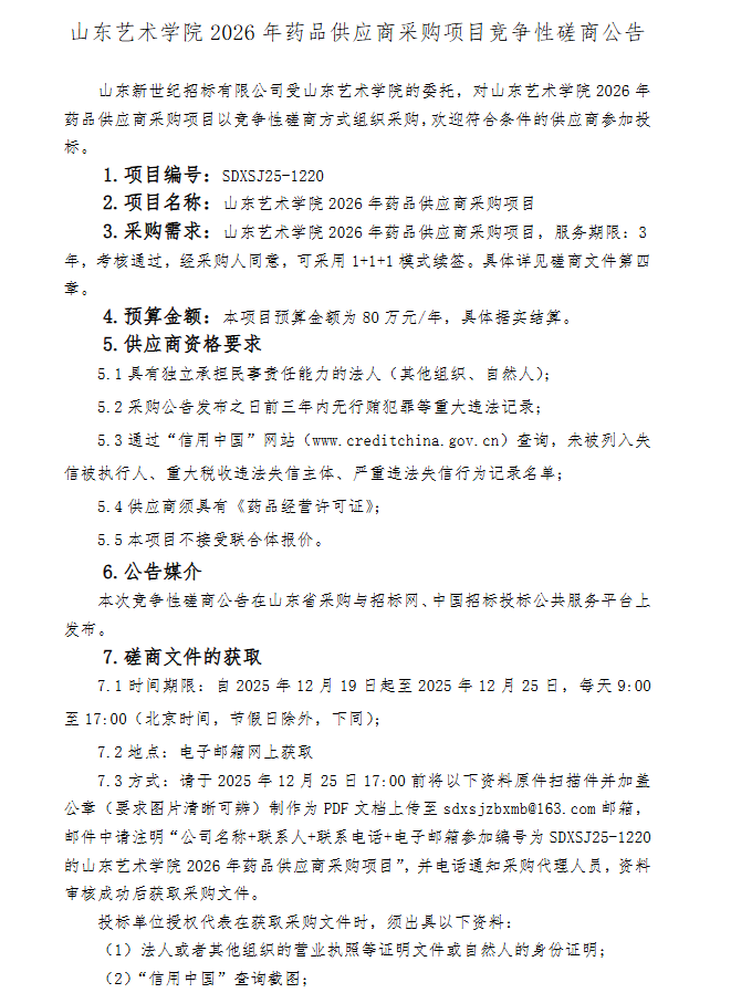 【山东艺术学院】山东艺术学院2026年药品供应商采购项目竞争性磋商公告