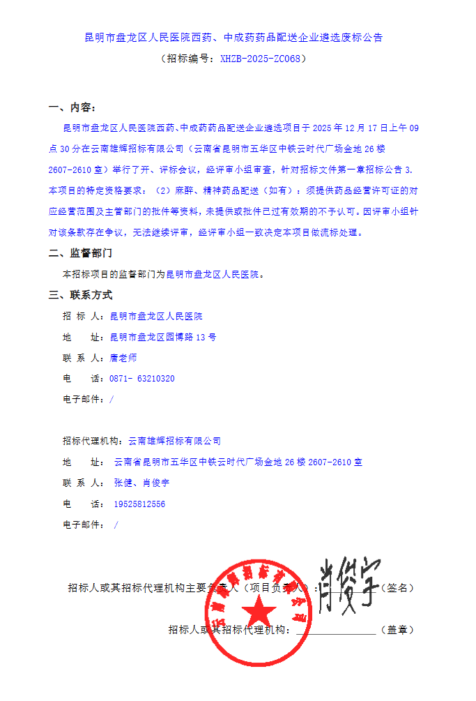 【昆明市盘龙区人民医院】云南省昆明市盘龙区人民医院西药、中成药药品配送企业遴选废标公告