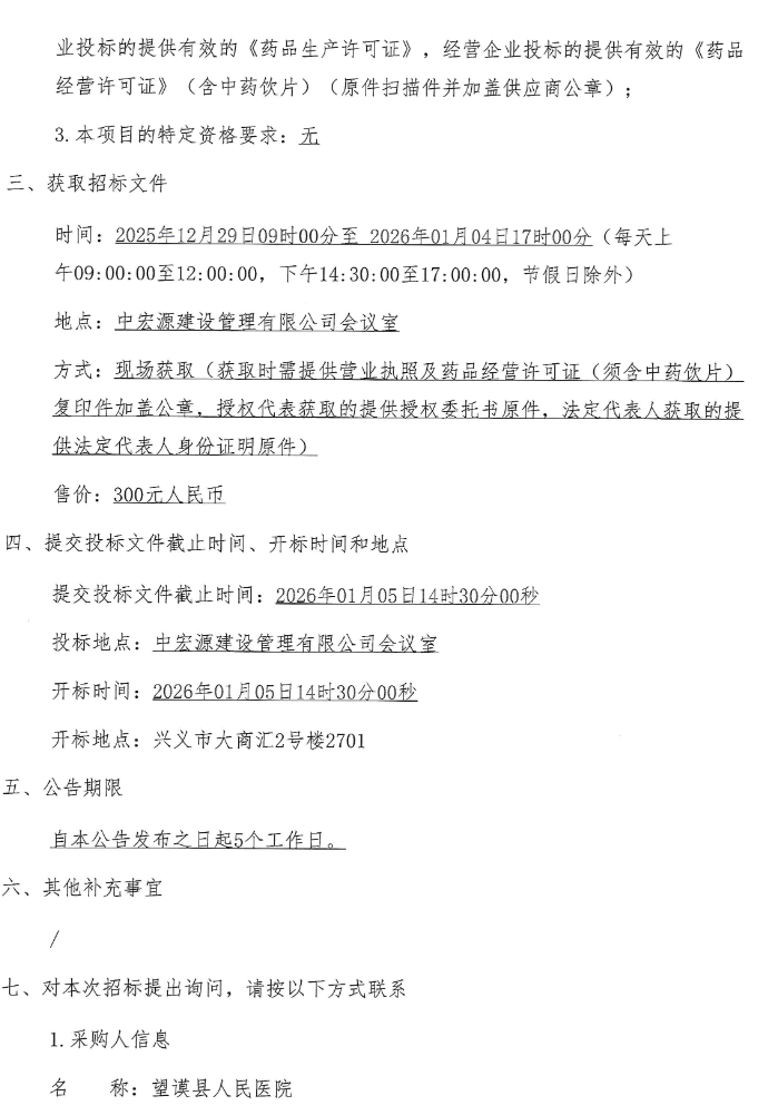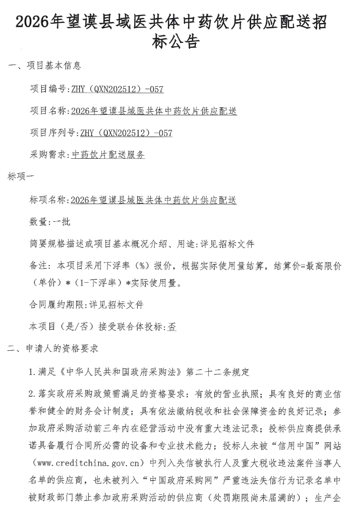 【黔西南布依苗族自治州望谟县人民医院】贵州省黔西南布依苗族自治州2026年望谟县域医共体中药饮片供应配送招标公告